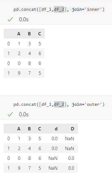 - join='outer' : df1을 기준으로 df들이 가지는 모든 열에 대해서 병합한다. 해당되는 열이 없다면 그 부분은 NaN값으로 채워진다
