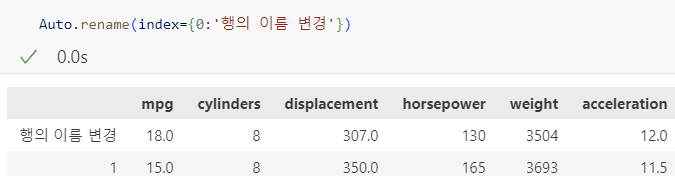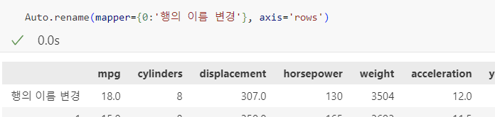 - 열이나 행의 이름을 변경할 수 있으며 axis='colums'이면 column을 rename, axis='index'면 row를 rename