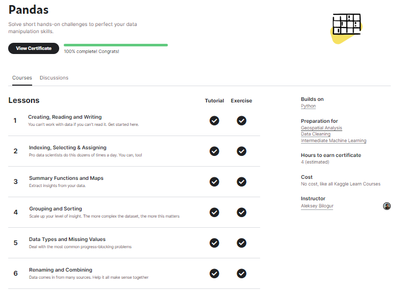 kaggle learn 신기해서 오랜만에 판다스 기초 한번 해봤는데 튜토리얼 기반으로 직접 코드 쓰면서 해보고 다양하게 시도하고 이러니까 더 도움이 되는것 같다. exercise로 한거 테스트까지 완료하면 아주 완벽... 은근히 재밌어서 다른 것들도 킵고잉..다 하고나면 깜찍한 certificate도 준다 (의미는 없어보이지만 그래도...)