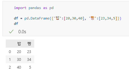 열의 이름('col1','col2')을 지정하고 이를 키로 하고 벨류 위치에는 해당 열의 데이터를 리스트 형식으로 표현한다. 행의 이름은 따로 정해주지 않아 기본 정수 인덱스(0~)를 할당한다.