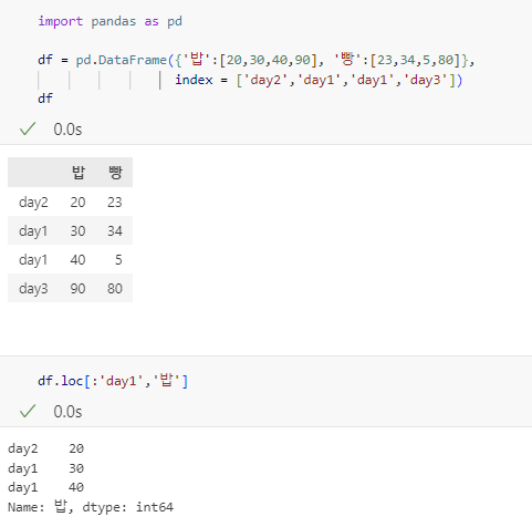 - 지정한 행, 열의 label로 조회한다 (만약 행, 열의 이름을 숫자로 지정했다면 정수 iloc과 같이사용할 수 있지만 행, 열의 이름을 문자로지정했다면 조회할 때도 문자로 조회해야한다)